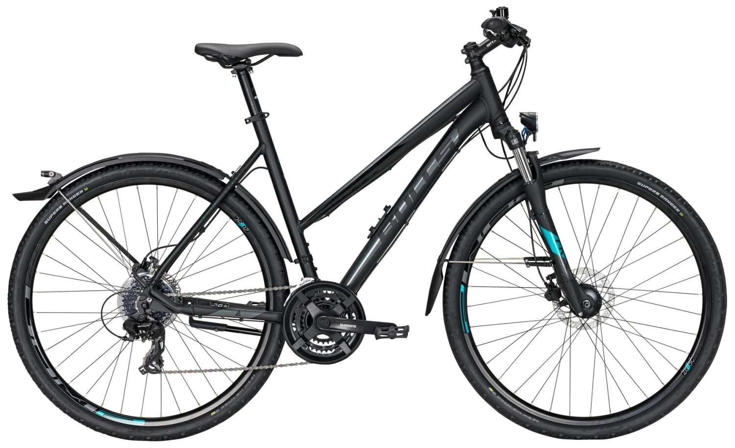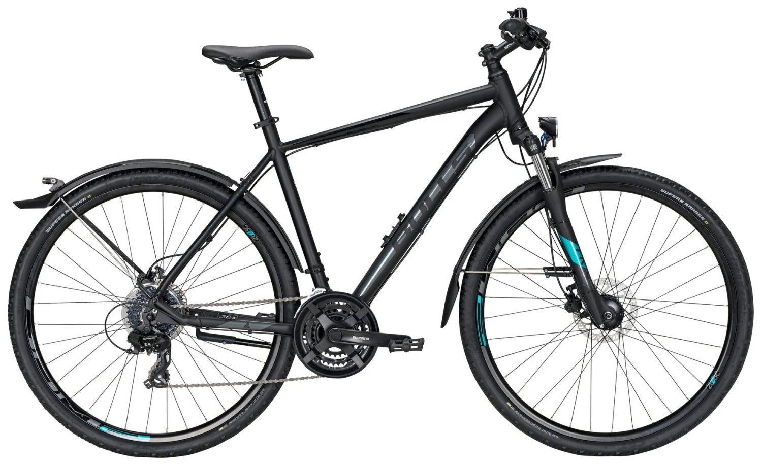 7005 Alu Rahmen, Suntour NVX-DS Federgabel einstellbar, 24-Gang Shimano Altus Schaltwerk und Schalthebel, Tourney Umwerfer und Kurbeln, Tektro HD-M275 hydr. Disc-Bremsen, DDM-2 Hohlkammer-Felgen, STYX Downhill-Lenker, A-Head Vorbau und Sattelstütze, Nabendynamo, 30 Lux LED-Lampe, Standrücklicht hinten auf dem Schutzblech