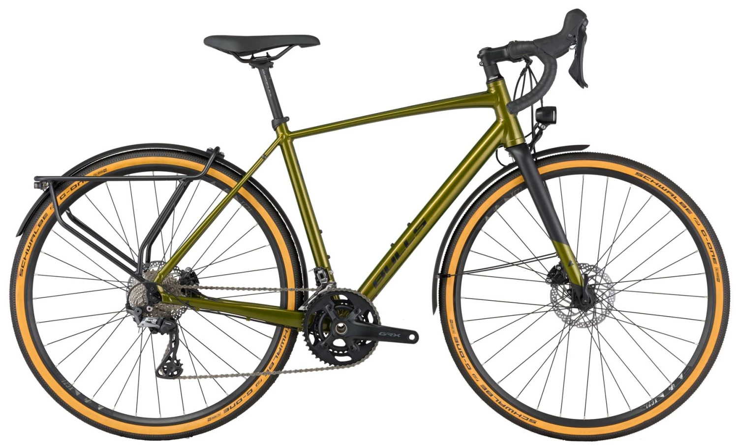 6061 Alu d.b. Rahmen mit tapered Steuerrohr, Carbon Aero-Gabel, Shimano GRX-810 22-Gang Compact Schaltwerk und Umwerfer, GRX-600 Brems-Schalthebel, GRX400 hydr. Scheibenbremsen, GRX-600 Kurbeln 30-46 mit Hollowtech-II Innenlager, 11-32 Zahnkranz, Schwalbe G-One Allround Reifen (40-622), XC-21 Disc Felgen, KT Nabendynamo, Bumm Lumotec IQ-XS Lampe, RL-Mini Rücklicht, Oversized Lenker, Cork Lenkerband