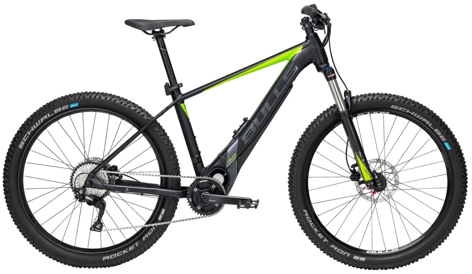 Hydroforming Alu-Rahmen, XCR-34-LO Boost Federgabel mit 120mm Federweg, Deore Schaltwerk, Schalthebel und 11-42 Zahnkranz, Tektro HD-M275 Disc-Bremsen (180/180mm), Bulls AS-35P Disc Felgen, Brose Mittelmotor Drive-S Alu 250W / bis 90Nm, 650Wh Akku aus dem Rahmen entfernbar, 14d Sport-Display, Rocket Ron Snake Skin 2.80 Reifen mit Addix Speedgrip, Monkey Link Lamenhalter