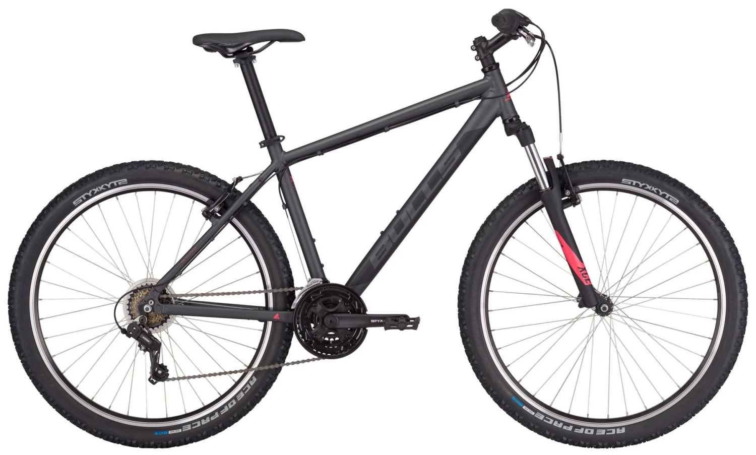 6061 Alu Rahmen, Suntour M-3010-P Federgabel, 18-Gang Tourney TY200 Schaltwerk, Revoshift Schalthebel und Umwerfer, Samox Aluminium Kurbeln, Formula Naben, Tektro V-Bremsen, STYX Alu Felgen, Alu Downhill-Lenker, A-Head Vorbau, 2-Bolt Sattelstütze, Bulls Sattel, STYX Ace of Pace Reifen 26×2,25 Zoll