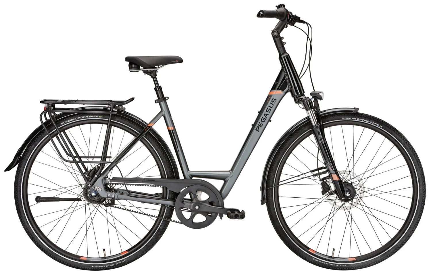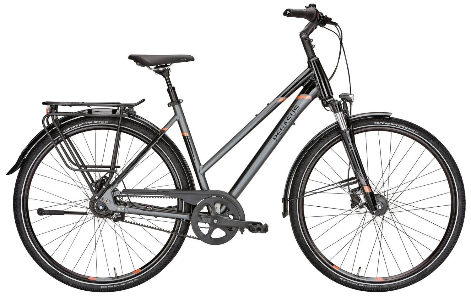 „Wenn PEGASUS Qualität auf Riemenantrieb und Nabenschaltung trifft, dann entsteht maximaler Fahrspaß bei minimalem Wartungsaufwand. Statt Kette macht der Carbon-Riemen nicht nur Schluss mit schmutzigen Händen, sondern bietet in Kombination mit der robusten Shimano 8-Gang-Nabe beste Fahreigenschaften. Dazu sorgen die hydraulischen Shimano Scheibenbremsen bei jeder Witterung für optimales Bremsverhalten. Komfort-Komponenten wie der breite Lenker und die Federgabel machen das Fahren noch angenehmer, sicherer wird es durch die leistungsstarke Lichtanlage und die pannengeschützten Reifen.“