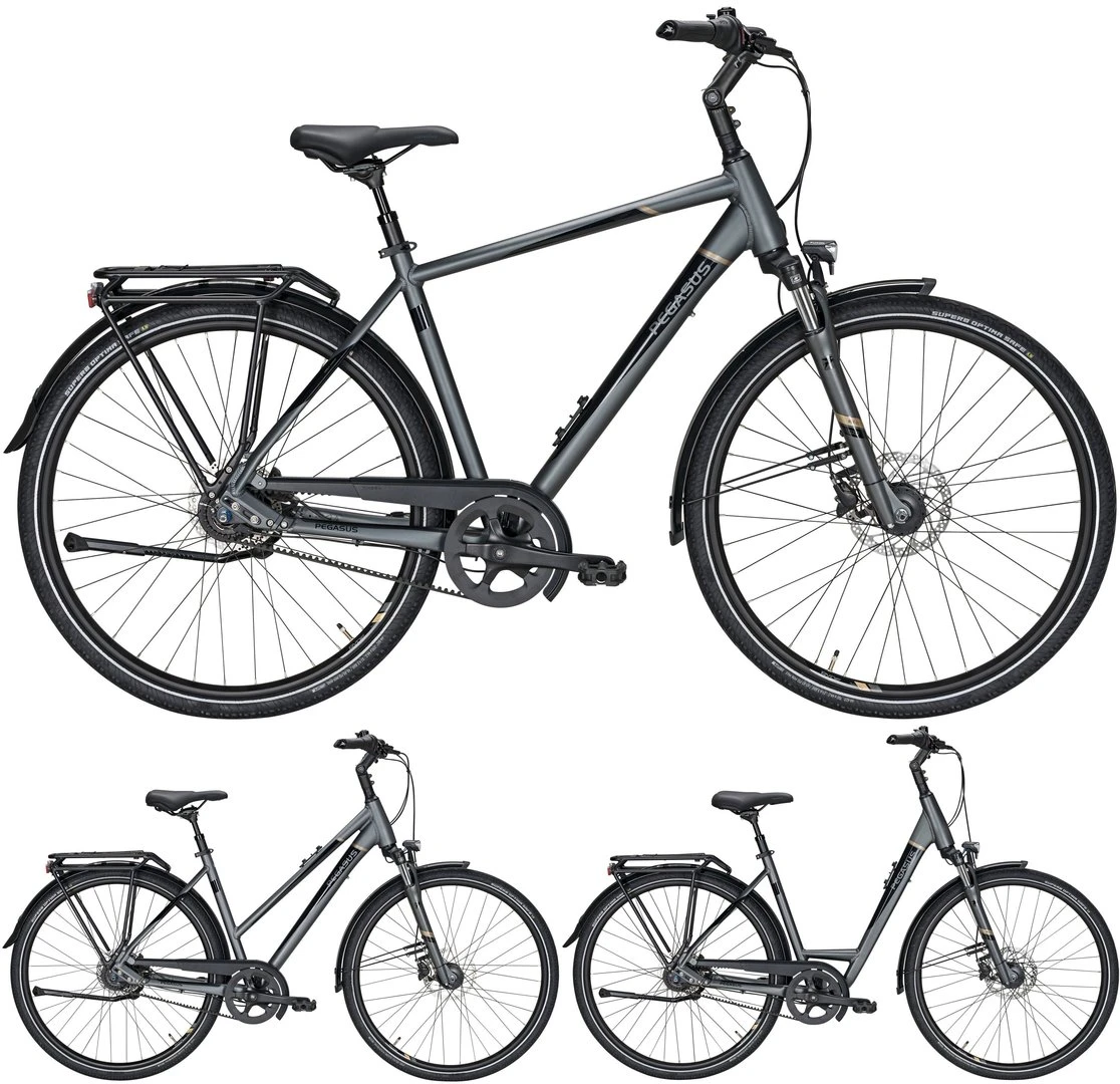 7005 Alu-Rahmen mit innenverlegten Kabeln und tapered Steuerrohr, Suntour NEX-DS Federgabel einstellbar, Nexus 8-Gang Nabenschaltung mit Freilauf und Revoshift Schalthebel, Gates Carbodrive CDN Riemenantrieb, Shimano MT201 Scheibenbremsen (160/180mm), Taurus 2000 Hohlkammer-Felgen, verstellbarer UP-Vorbau, FixSystem Ergo-Griffe, Nabendynamo, LED Sensor-Lampe, Standrücklicht