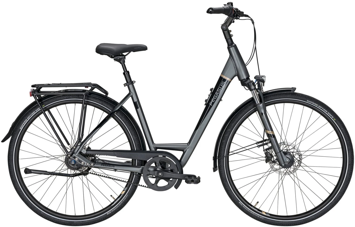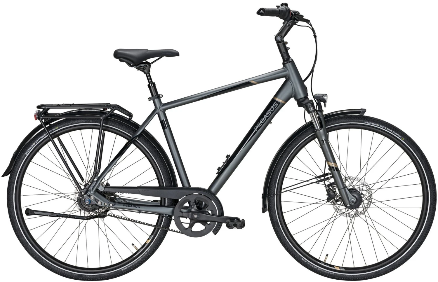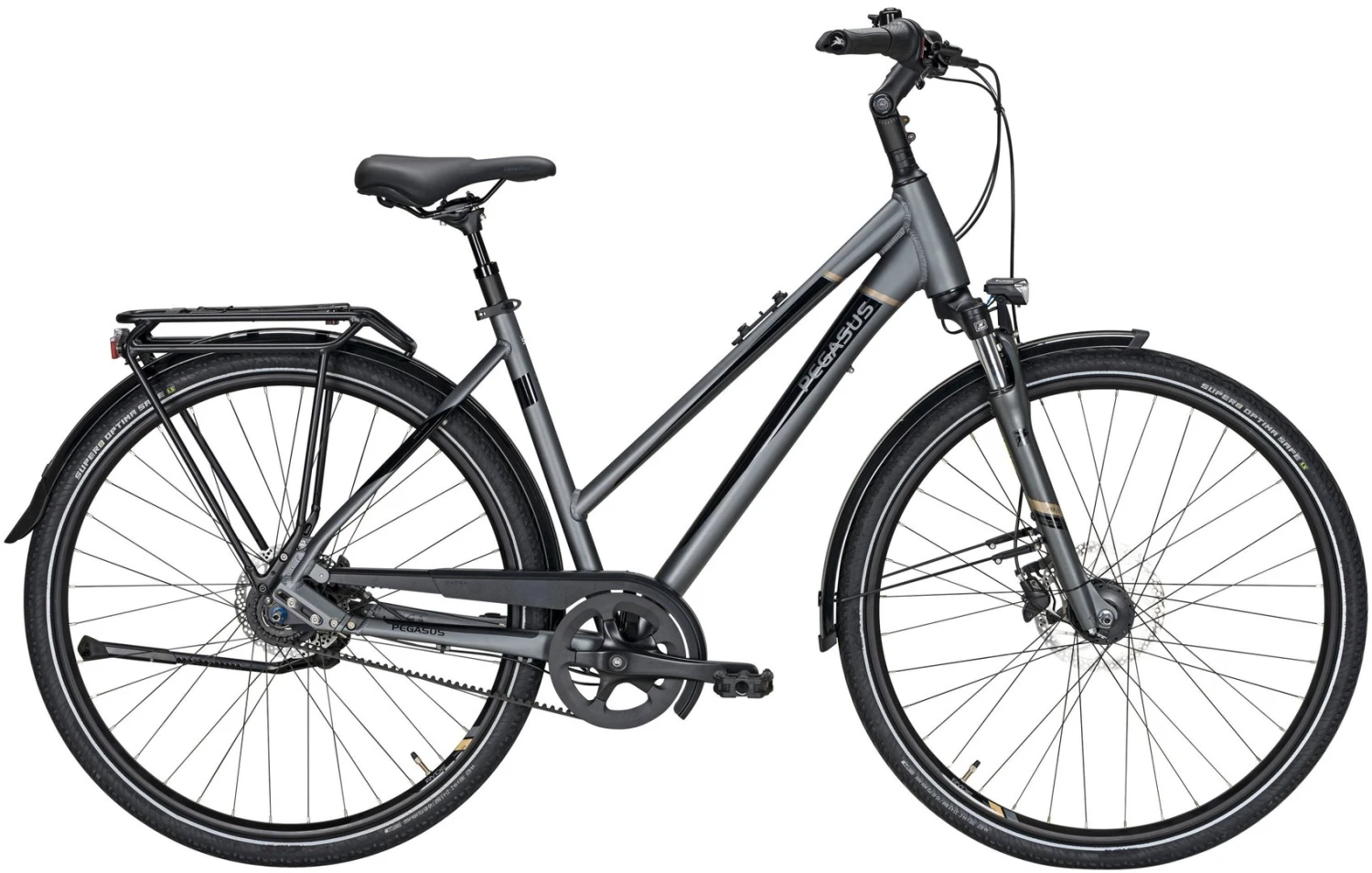 Beim in drei Rahmenformen verfügbaren Tourenbike liegt der Focus auf Fahrkomfort und Wartungsarmut. Die angenehm aufrechte Sitzhaltung des Premio SL Belt 8 ist langstreckentauglich und erlaubt dank geschwungenem Lenker eine entspannte Positionierung der Arme, wobei eine hochwertige Federstütze sowie eine Federgabel mit 63 mm Weg für Komfort sorgen. Der Übersetzungsumfang der 8-Gang-Nabeschaltung ist groß genug für Touren und Alltagsfahrten; in Sachen Wartungsarmut ist die Kombination aus Getriebeschaltung und Zahnriemenantrieb nicht zu schlagen. Starke hydraulische Scheibenbremsen verbinden kurze Anhaltewege in jeder Situation mit feinfühliger Dosierbarkeit. Eine LED-Lichtanlage mit Standlicht-Automatik vorne wie hinten und ausfallsicherem Nabendynamo sorgt für gute Sicht und Sichtbarkeit, und die 44 mm breiten Reifen bieten einen guten Kompromiss aus Leichtlauf und Vibrationsdämpfung. Am elegant geformten Systemgepäckträger lässt sich die Office-Bag ebenso leicht befestigen wie Reisetaschen.
