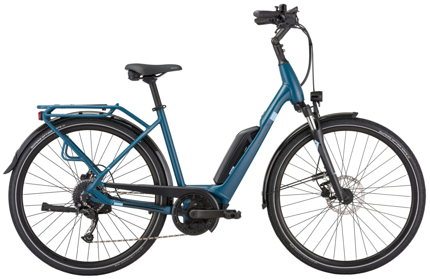 7005 Alu-Rahmen mit integrierten I-Rack Gepäckträger, NEX-E25-DS Federgabel, Alivio 9-Gang Schaltwerk und Schalthebel, Tektro HD-T275 Disc-Bremsen (160/180mm), DDM-2 Hohlkammerfelgen, verstellbarer Lenkervorbau, Bosch Performance-CX Mittelmotor mit 400Wh oder 500Wh Akku (Aufpreis), Supero Optima Safe Reifen 44-622, 12 Volt Beleuchtung mit 50 Lux LED-Lampe